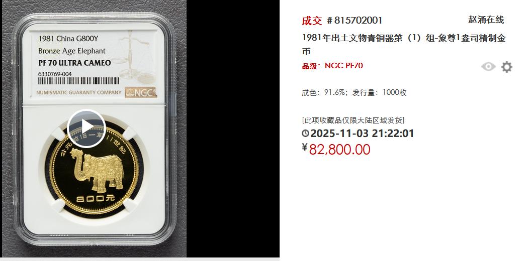 而“精”,则体现时极致的工艺与品相上。1981年出土文物青铜器系列中的“象尊”1盎司金币,以8.28万元成交,关节在于它赢得了NGC PF70的满分评级。在顶级藏家眼中,这种“精制”工艺与完整景象的联结,是藏品能穿越周期、造反阛阓波动的坚贞铠甲。