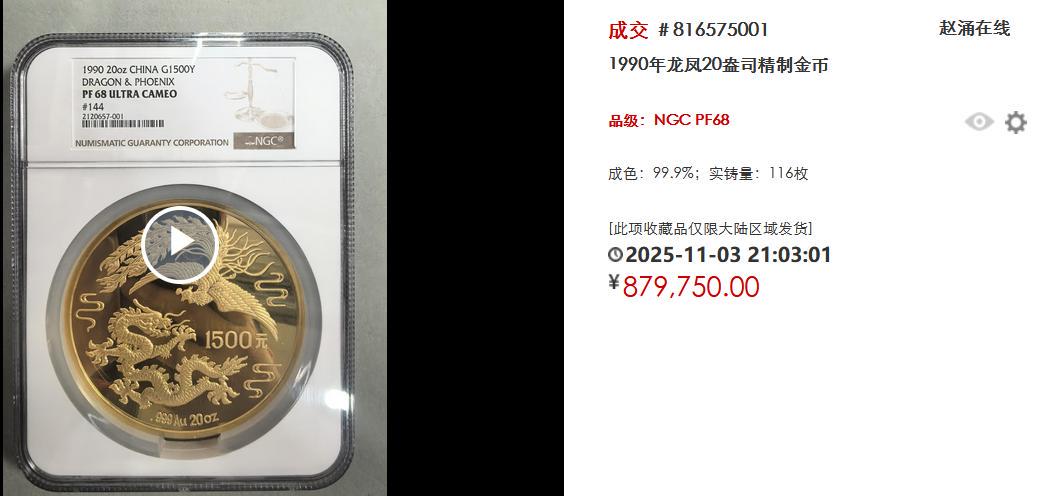在金银币保藏的全国里,总有一些数字让东说念主屏住呼吸。2025年11月,赵涌在线的一枚1990年龙凤20盎司精制金币,以接近百万元的价钱落槌。这个令东说念主咋舌的数字,仿佛一束光,照亮了“老精稀”这三个字在岁月中千里淀出的不朽价值。它无声地告诉咱们,确凿寥落的,从来不仅仅金银自己。