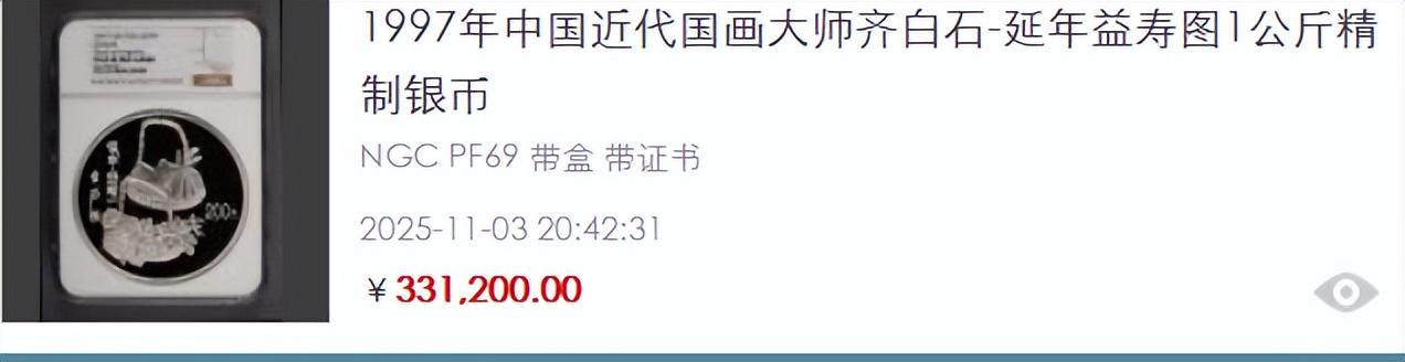 通常将“精”与“稀”阐明到极致的,还有1997年刊行的都白石《延年益寿图》1公斤银币。它不仅是贵金属,更是一幅用当代铸币技能复刻的国度级艺术瑰宝,33.12万元的成交价,恰是对其艺术价值与稀缺性的双重笃定。
