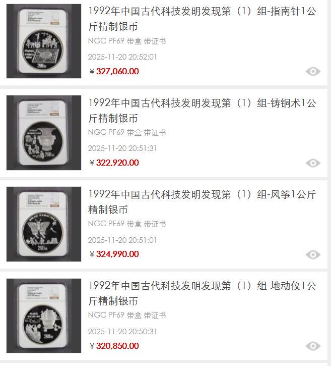 最艰巨的中枢,莫过于“稀”。存世量的几许,最终决定了价值的峰值。1992年中国古代科技发明发现第一组,四枚1公斤精制银币同期上拍,成交价系数冲破32万元,酿成了一个令东说念主瞩办法高价板块。这种“系列性”的稀缺,加上公斤银币的大规格和颠倒题材,使得它们成为阛阓上可遇不成求的珍品。
